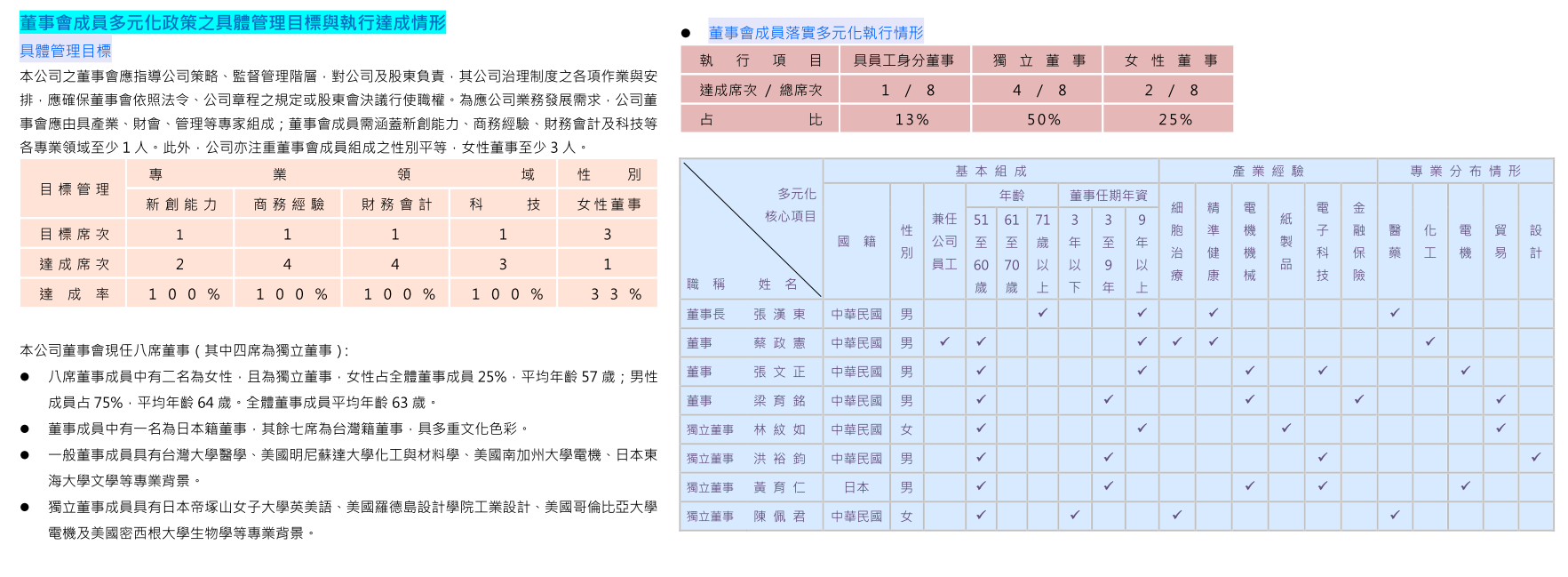 - 八席董事成員中有一名為日本籍董事,其餘七席為台灣籍董事,具多重文化色彩。