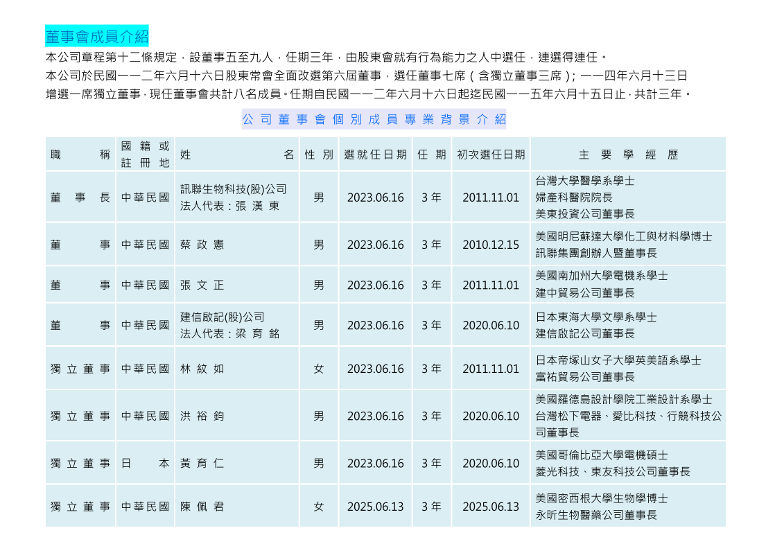 本公司於2023年股東常會全面改選第六屆董事,選任董事七席(含獨立董事三席);2025年另增選一席獨立董事,現任董事會共計八名成員。《看更多>>> 董事會個別成員專業背景介紹 》