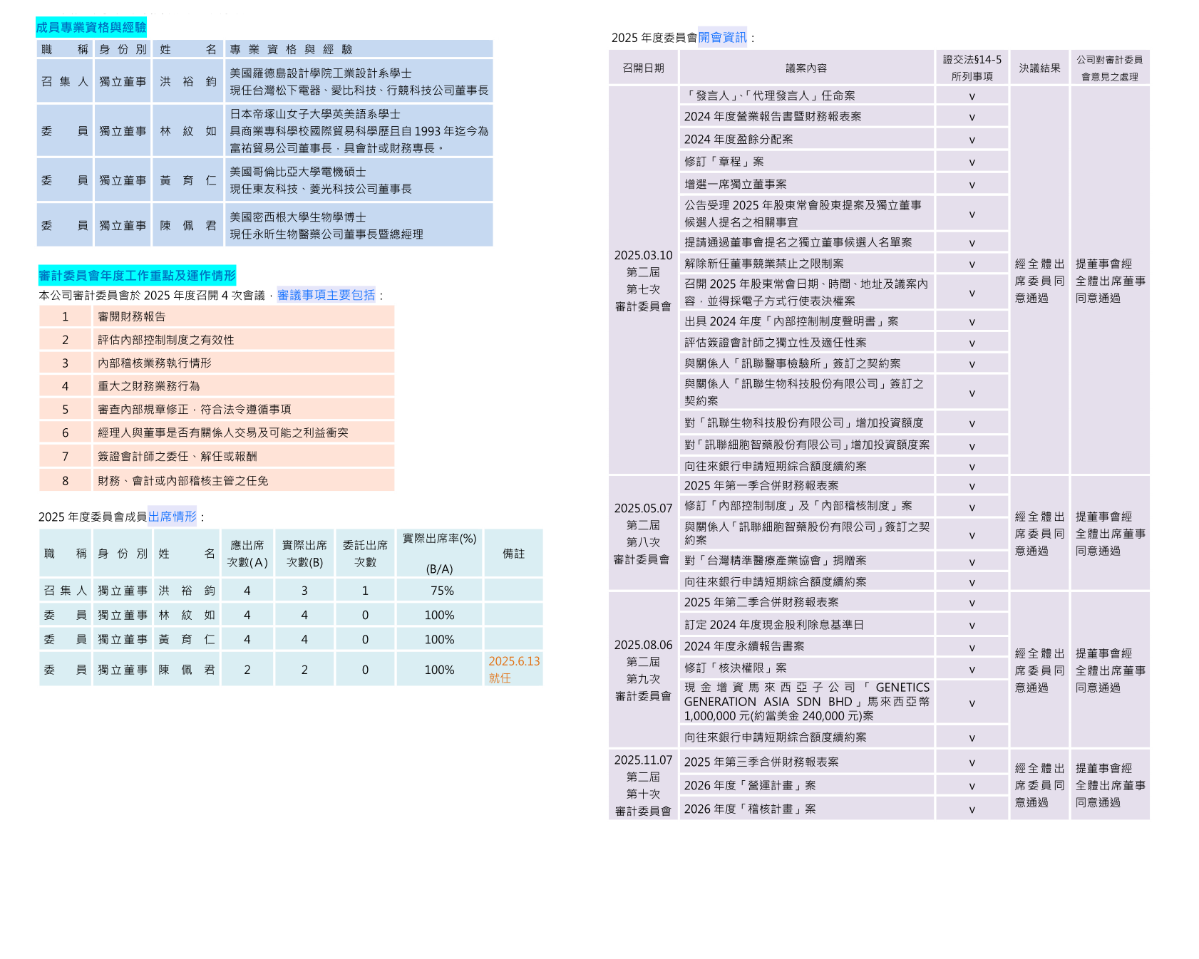 審計委員會每季至少召開一次會議,2025年度開會4次,成員至少皆親自出席2次(含)以上會議。《看更多>>> 成員專業資格與經驗、當年度工作重點及運作情形》