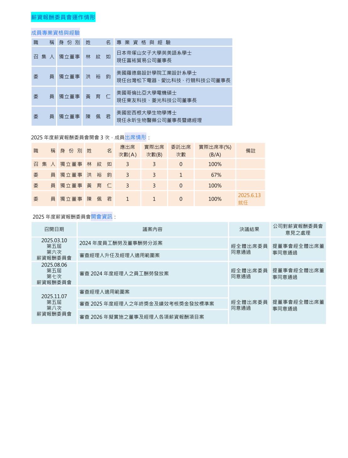 薪資報酬委員會每年至少召開二次會議,並每年定期進行薪資報酬委員會之內部績效評估。2025年度開會4次,成員至少皆親自出席2次(含)以上會議。《看更多>>> 成員簡歷、開會資訊及出席情形》