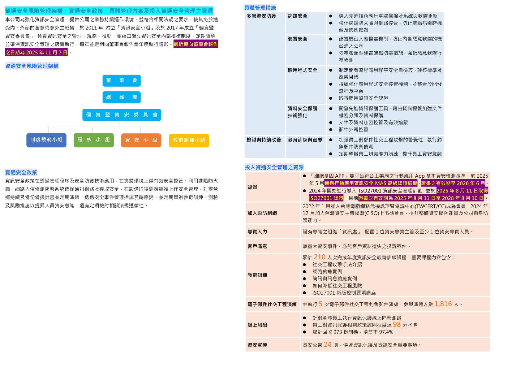 本公司資通安全政策為「維護公司資通之機密性、完整性、可用性與適法性,避免發生人為疏失、蓄意破壞與自然災害時,遭致資通與資產遭致不當使用、洩漏、竄改、毀損、消失等,影響公司作業並導致公司權益損害」。本公司於2024年開始進行導入 ISO 27001 資通安全管理系統,並於2025年取得 ISO 27001 認證,目前證書之有效期為2025 年 8 月 11 日至 2028 年 8 月 10 日。透過 ISO27001 資通安全管理系統之導入,強化資通安全事件之應變處理能力,保護公司與客戶之資產安全。