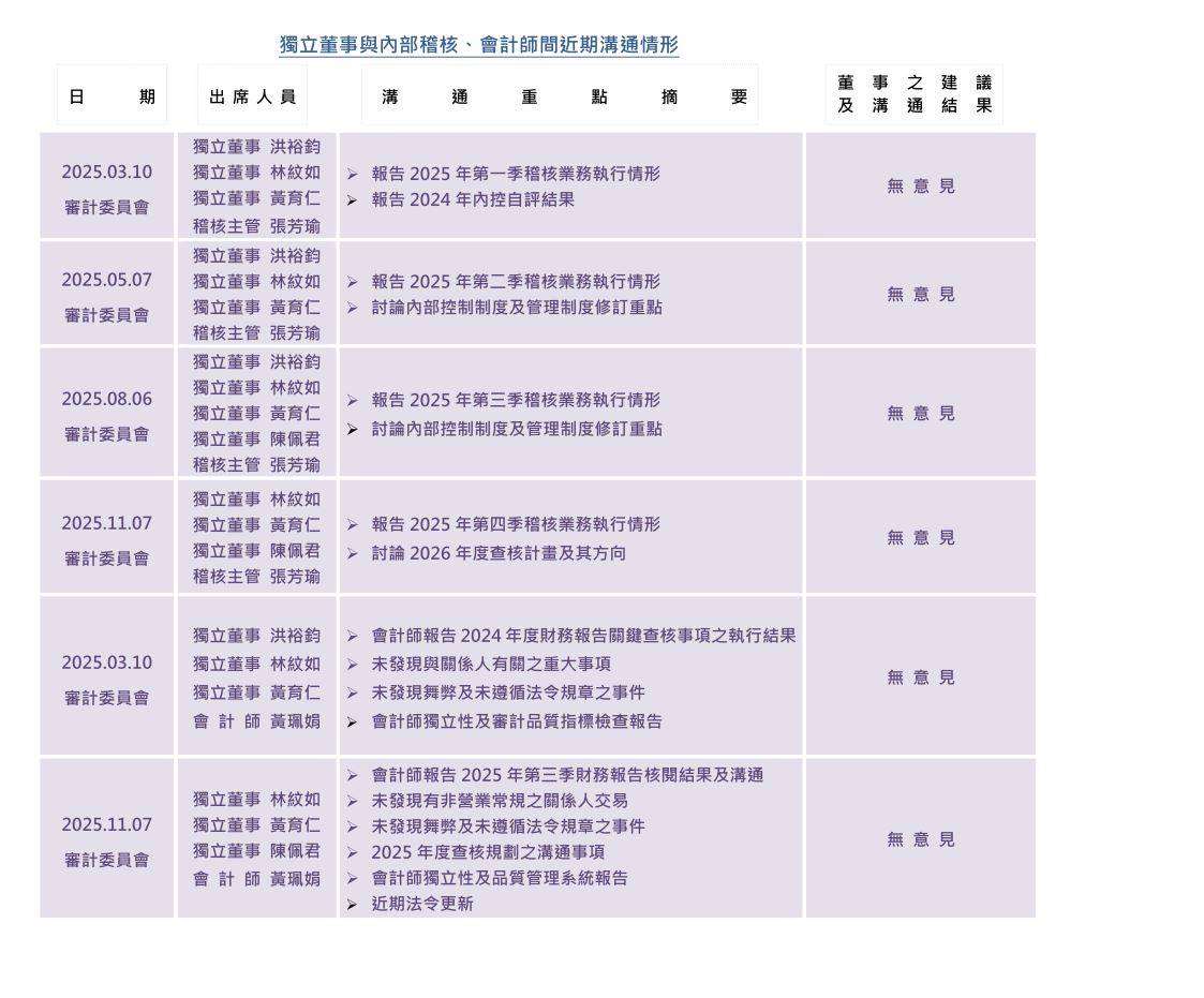 《看更多>>> 獨立董事與內部稽核、會計師間之近期溝通情形》